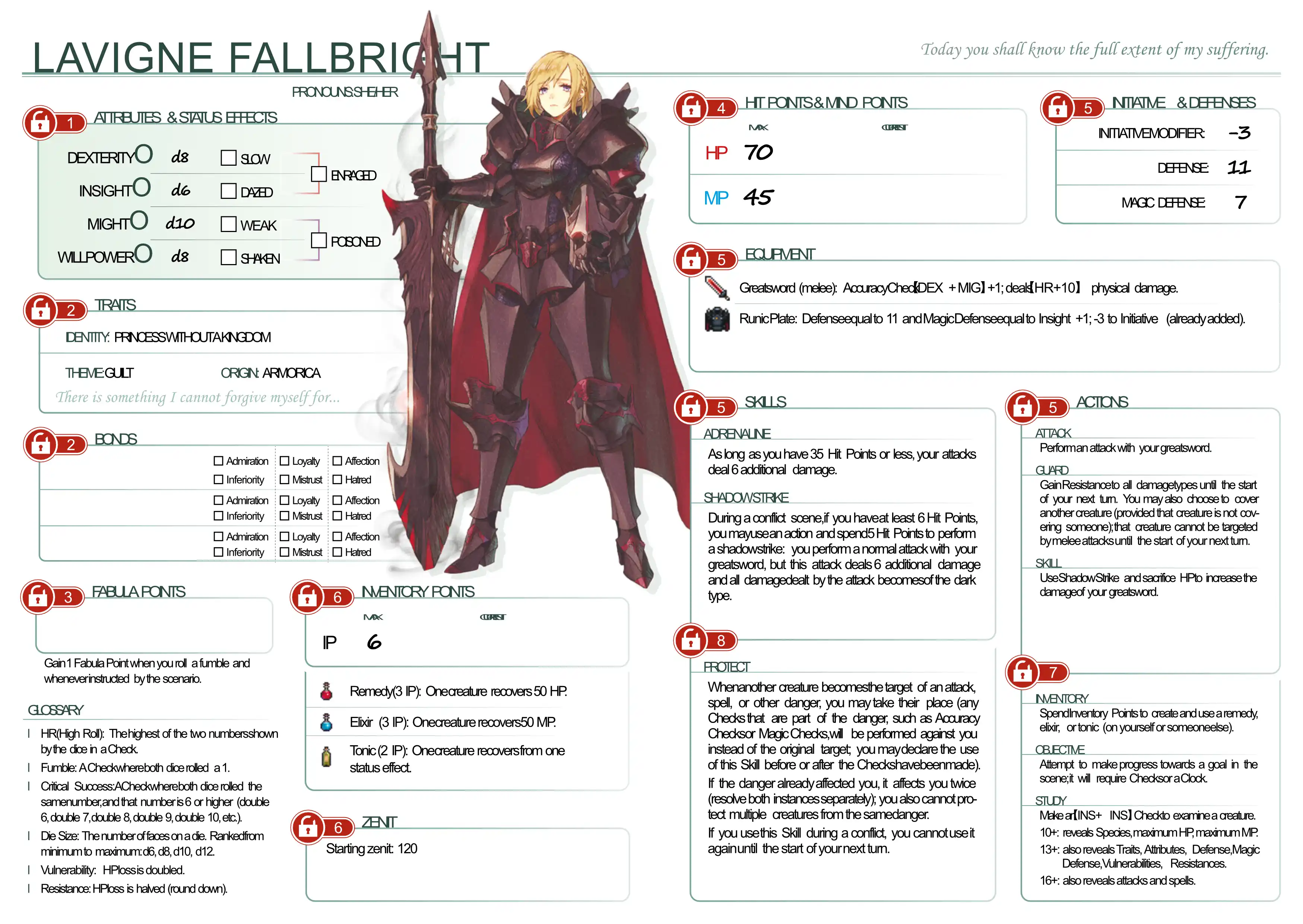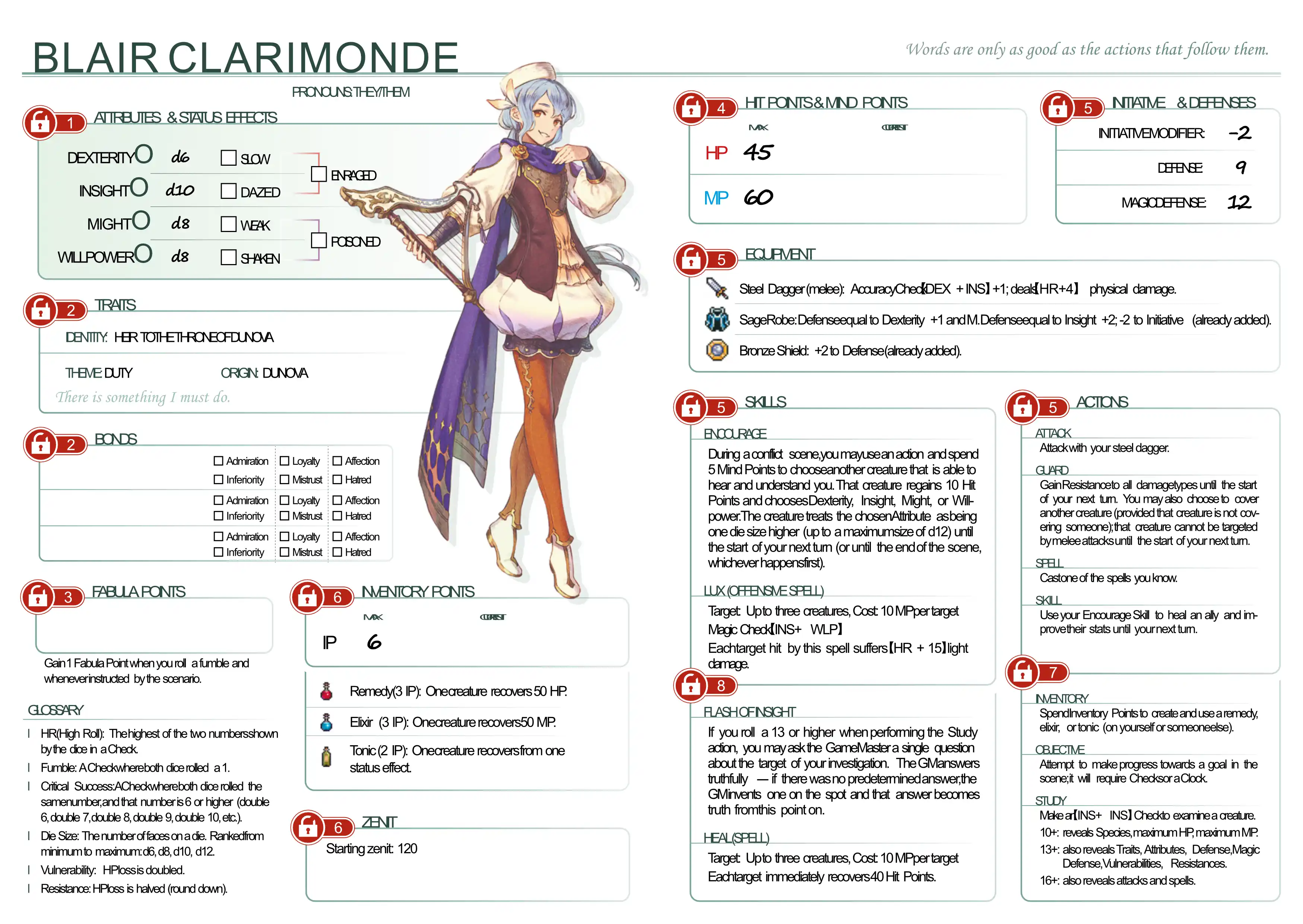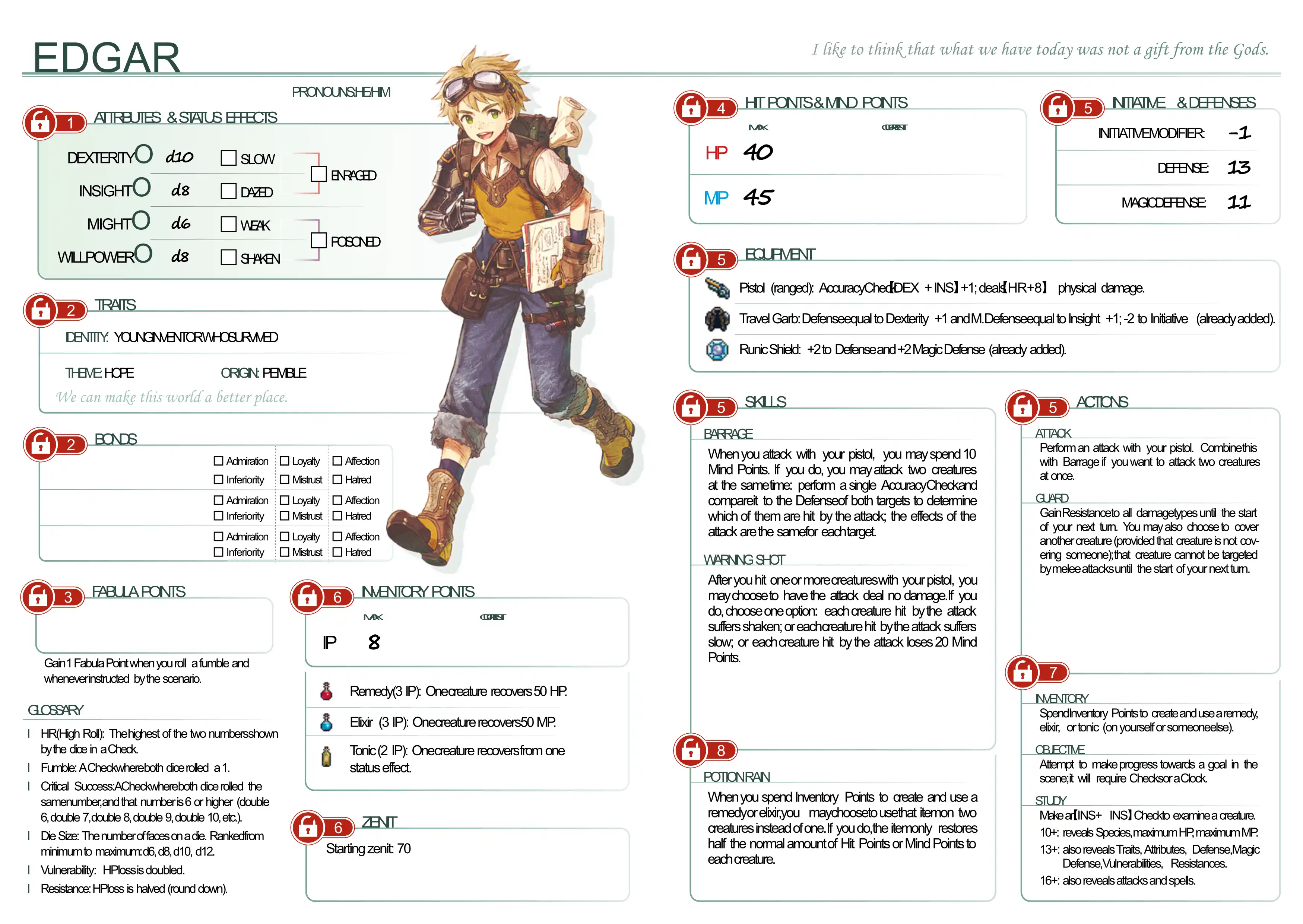 Heroes in Fabula Ultima are extraordinary individuals, and the game encourages you to take this into account. A child with incredible magical powers and a veteran warrior who can take on an entire army are equals here - what matters is strength of spirit. Who are they? why are they on the journey? What do they specialize in?