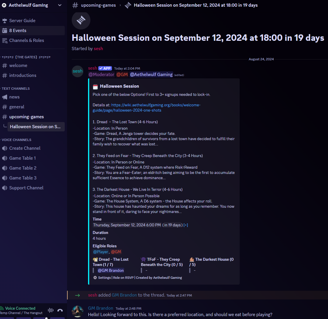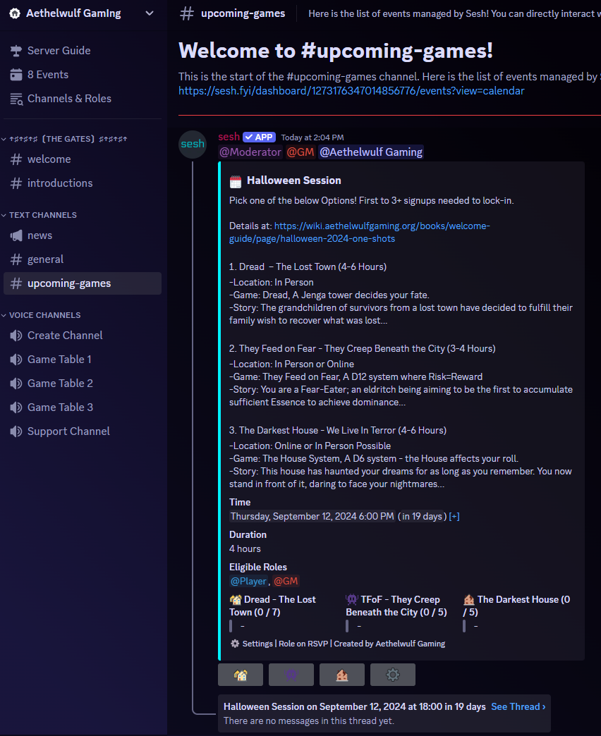 I am running SPoOoOky games this September and October! Every Thursday and/or Friday at 6PM. Saturday and/or Sunday at 4PM.